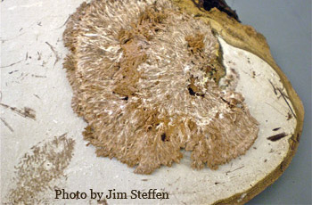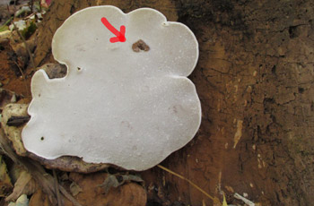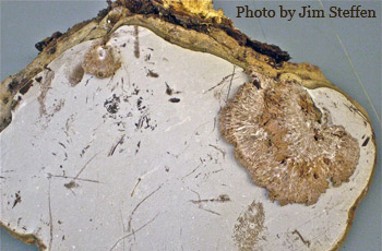 - A feathery and radiating matt of mycelium attached to underside of bracket. Color whitish becoming brown from trapped spores. See references below for description of perithecia and microscopic characters.