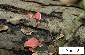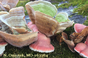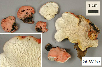 - Annual merulioid or stereoid fungus. Caps pinkish, up to 7 cm wide. Underside wrinkled, whitish. Spore print white.
