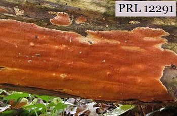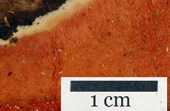 - Annual effused poroid crust, spreading over wide area; up to 3 mm thick. Brightly colored orange, reddish orange to brownish orange, drying reddish brown. Margin pale and