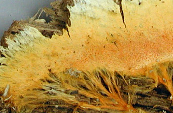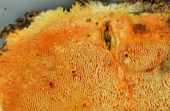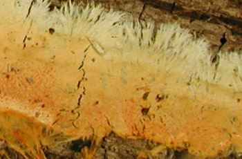 - Thin effused crust, with teeth up to 1.5 mm long. Loosely attached to wood or wood debris. Color bright orange to reddish orange; teeth yellow to orange. Margin of crust noticeably fimbriate (with radiating hyphae) and with orange cords. Hyphal system monomitic; generative hyphae thin to thick-walled, usually encrusted with crystals; most septa lacking clamps. Spores narrowly ellipsoid to cylindrical, 4–6 × 2–3 μm, smooth, thin-walled, inamyloid.