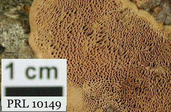 - Annual, bracket sessile to effused reflexed. Cap surface and pores dull orange to cinnamon brown. KOH turns all parts violet. Flesh soft and fibrous, becoming light and somewhat brittle when dry. Pores angular, 2–4 per mm. Microscopic characters: monomitic, generative hyphae with clamps, branched and thick-walled in the context; cystidioles same size as basidia; spores elliptical, hyaline, thin-walled, 3.5–5 × 5–6.5 µm (Gilbertson and Ryvarden 1986).