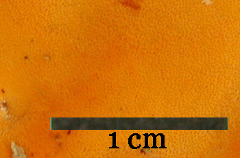 - Annual effused poroid crust, spreading over wide area; up to 3 mm thick. Brightly colored orange, reddish orange to brownish orange, drying reddish brown. Margin pale and