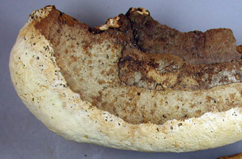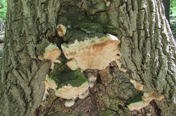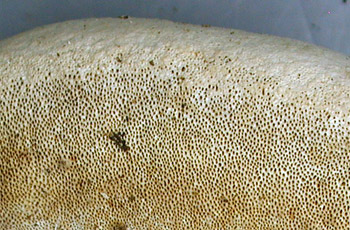 - Perennial, single or overlapping conks formed on trunk and main branches. Upper side narrow to wide, with a rounded whitish margin, older parts gray to black and cracked. Pores whitish, 3–5 per mm. Flesh pale brown to moderate brown. Spores are white, 9–11 μm, elliptical, thick-walled, truncate at end with germ pore.
